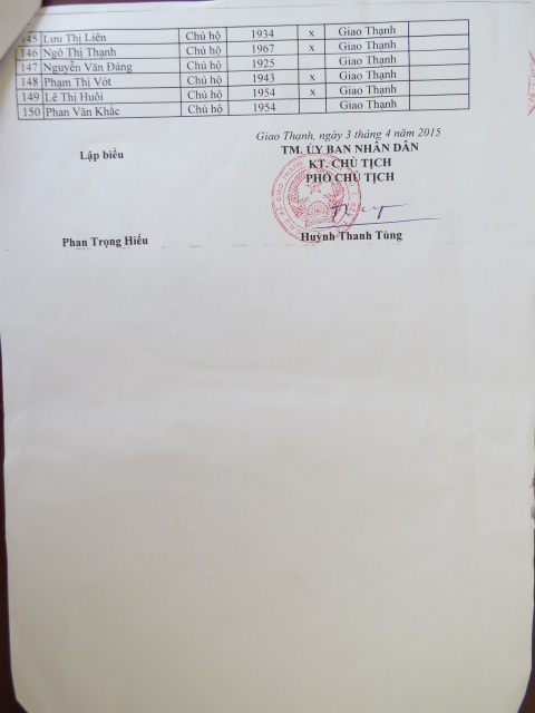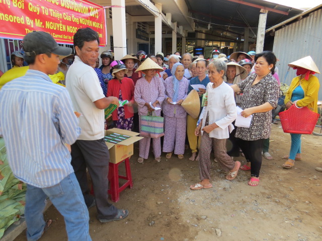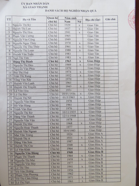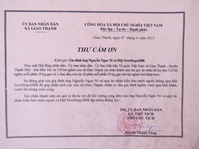 Chúng ta đã tổ chức một cuộc phát gạo và dầu xanh tại Giao Thạnh nơi chôn nhau cắt rún của chú và có mời gia đình chú đến tham gia. Chúng ta đã nhờ chùa ở Giao Thạnh và làng xã chọn ra 150 gia đình nghèo khó. 132 gia đình đầu tiên được nhận 10 k y' gạo và 1 chai dầu xanh; 18 gia đình còn lại được nhận 20 k y ' gạo . Xin cảm ơn các bạn đã tài trợ cho chương trình phát gạo này: