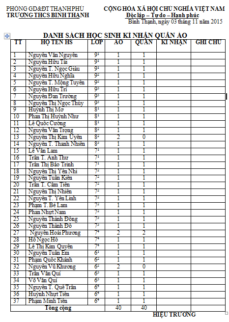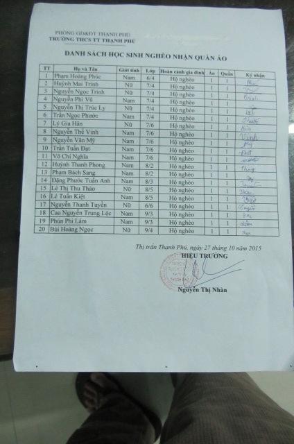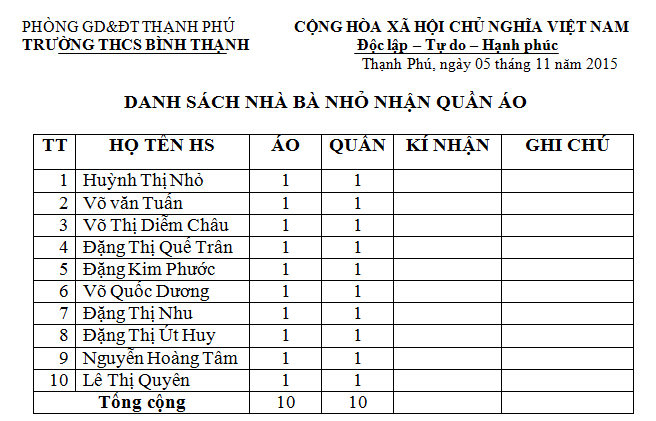 1/ HS trường THCS Thị Trấn Thạnh Phú có 20 người nhận 20 áo, 20 quần.