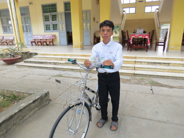Giving a bicycle to Từ Văn Cao, a student at Giao Thanh High School: