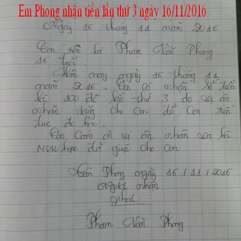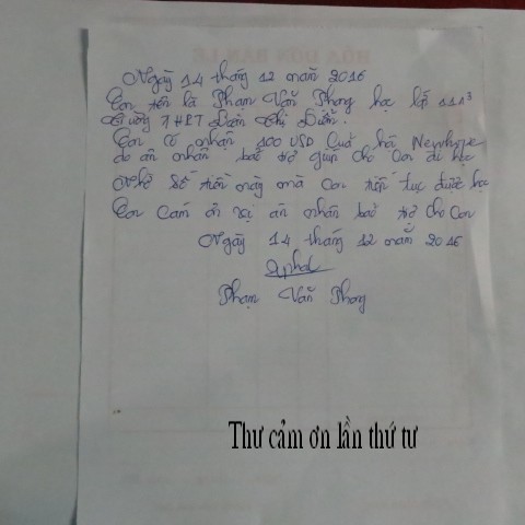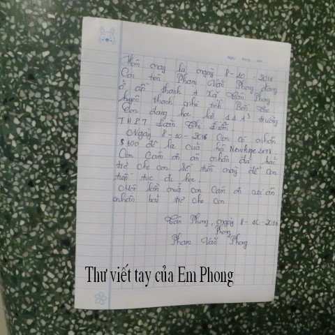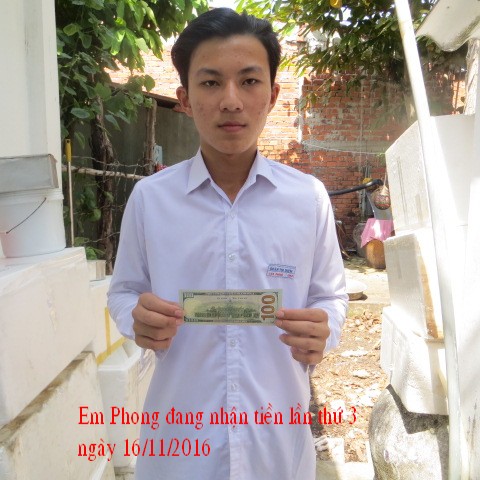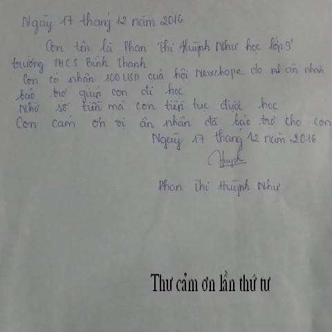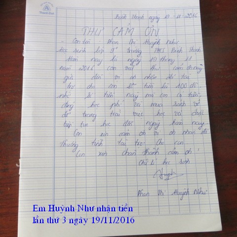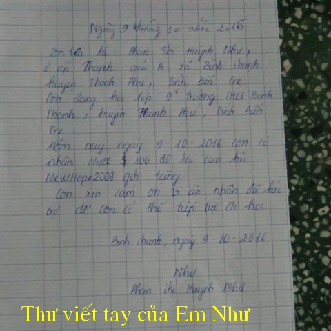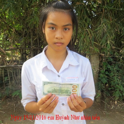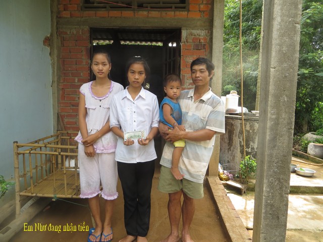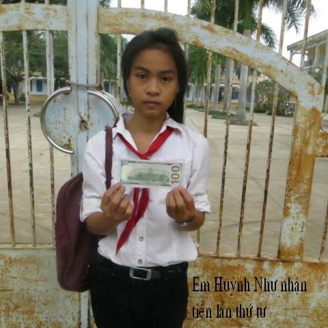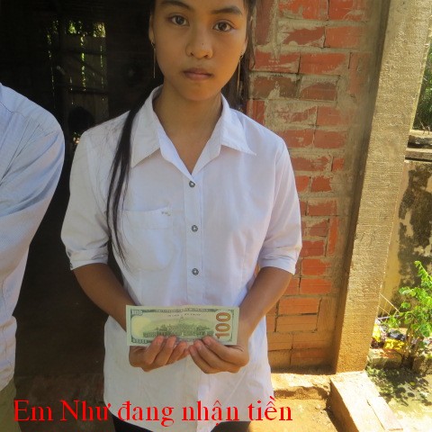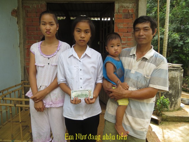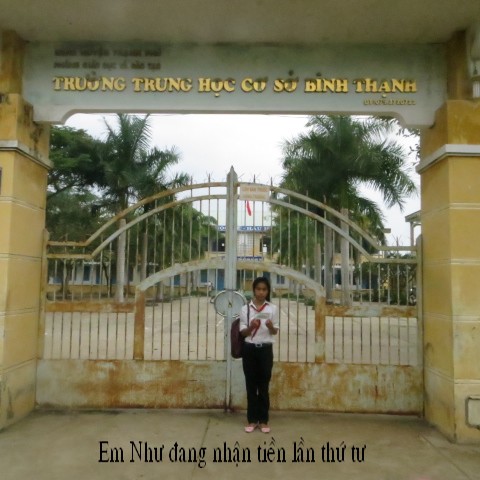 2/ Em Phan Thị Huỳnh Như đang học lớp 9 trường THCS Bình Thạnh. Mẹ em bị bệnh ung thư đã chết cách nay hơn một năm. Nhà em có 4 người. Ba em Ông Phan Văn Bé Chín, 40 tuổi. Chị em là Phan Thị Ngọc Hân, 18 tuổi đang thi đỗ Đại học sư phạm ngành Văn. Bé trai nhỏ mới 2 tuổi. Ba em không nghề nghiệp ai thuê gì làm nấy mỗi ngày 150.000 đồng (7 đô) nhưng ngày có ngày không. thu nhập rất bấp bênh. Hiện ngụ tại số nhà 116/2, ấp Thạnh Quí B, xã Bình Thạnh, huyện Thạnh Phú, tỉnh Bến Tre.