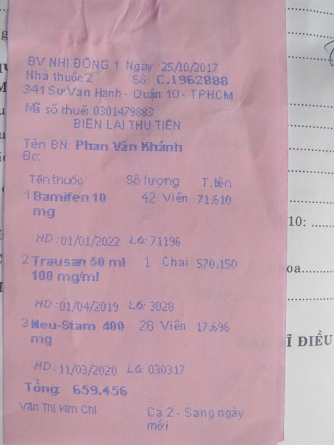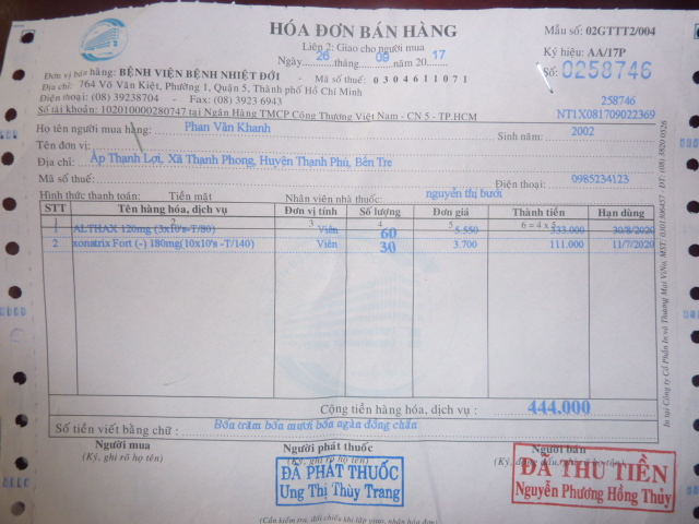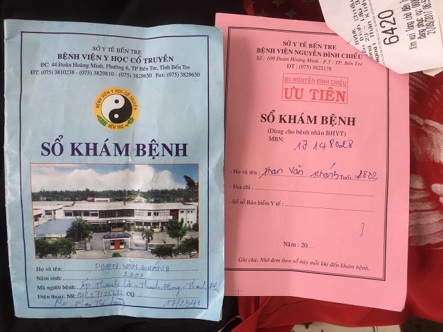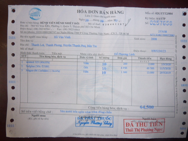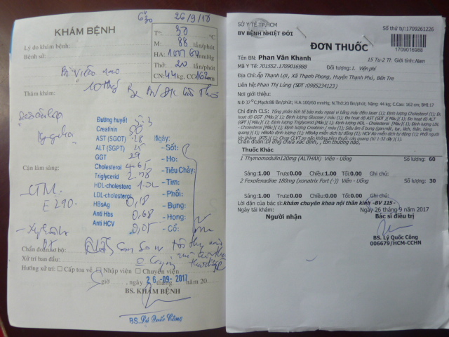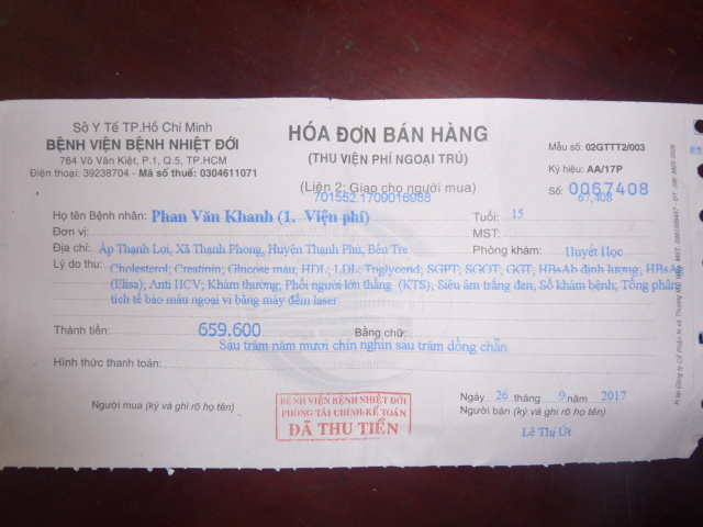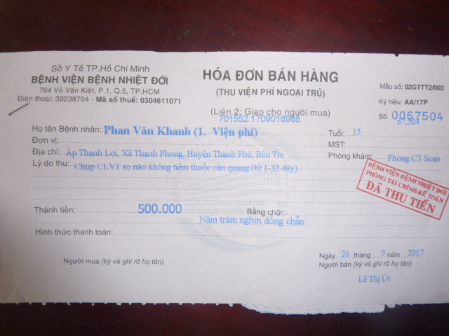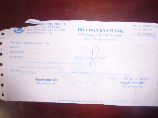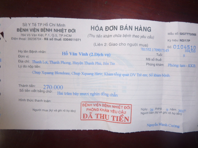 bị nhức đầu rất nhiều nữa . Lần sau ngày 24 tháng 10 em Khánh sẽ đi tám khám thì chúng ta cũng lại dẩn người em đi theo để khám lần nữa . Dưới đây là biên nhận khám bệnh và toa thuốc của em. Đáng lẽ em không bị tốn tiền vì trong sổ hộ nghèo nhưng nhà thương Bến Tre không chịu ký giấy chuyển viện cho em vì họ nói bệnh em không chửa