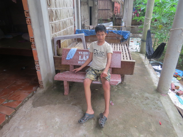 Phan Van Khank, 15 years old, resides in Con Mit Hamlet, Thanh Phong Village, Thanh Phu District. His father's name Ho Van Xuyen and mother is Phan Thi Lung (he’s taking his mother surname). There are 4 members in this household: the parents, Khanh and his brother. They have no farming land. Every night his parents catch sesarmids to sell to make a living. Due to his parents were not able to make ends meet, he dropped out of school at 9th grade and starting working to help out. He works as a snails digger for a boat owner in Ca Mau. Nine months ago, he started having a headache and that led him into a coma. After waking up, his brain was not functioning normally. He was not able to walk and is bound to a wheelchair. The doctors said if the family could afford it, take him to a hospital and getting physical therapy, and it could help him walk again or at least put his clothes on by himself. His family took him there but ran out of means to keep him there so they took him back home. His younger brother had quit school after Khanh got sick, and started helping the family, and who knows why, the younger brother now is getting the same illness. The younger brother started having a headache and gradually losing his intelligence just like Khanh. The family has been exhausted these last few months and struggling every day to cover medical costs for their two sons and put foods on the table.