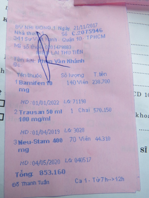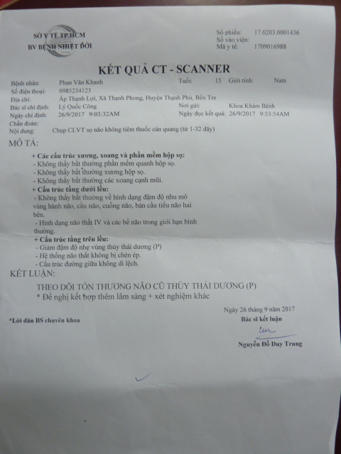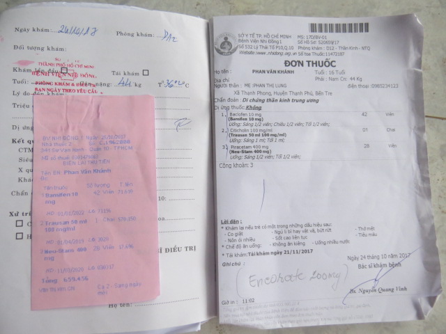 We took Phan Van Khanh to a hospital in Saigon. After MRI and blood tests, the doctor informed he has encephalitis and has spread to the major nervous system; The doctors are unsure if he can be cured and gave him medicines to take for a month. He will need to come back for follow up check up. Yesterday, his mother informed he was able to speak little like "I want to eat rice".