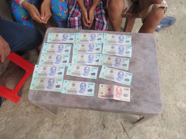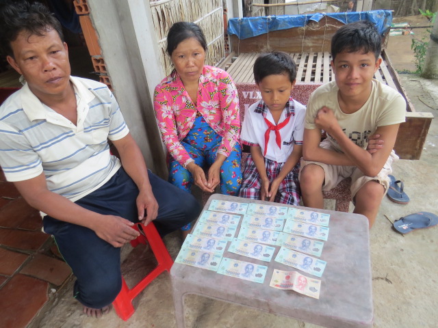 Dưới đây là hình em Khanh và gia đình đang nhận tiền bảo trợ , và lá thơ cám ơn của ba em.
