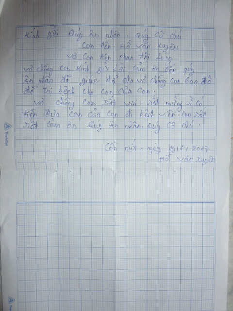 Các bạn bảo trợ đã tặng cho em $600. Số tiền này tạm thời đủ để em điều trị tiếp tục. Nghe bác sĩ nói cần khỏang $1000 mới đủ trả cho 6 tháng trị liệu của em. Chúng tôi sẽ cho người đến nhà thương thăm em và sẽ hỏi thăm xem em bị bệnh gị. Có hỏi gia đình nhưng ba mẹ em cũng không biết rõ.