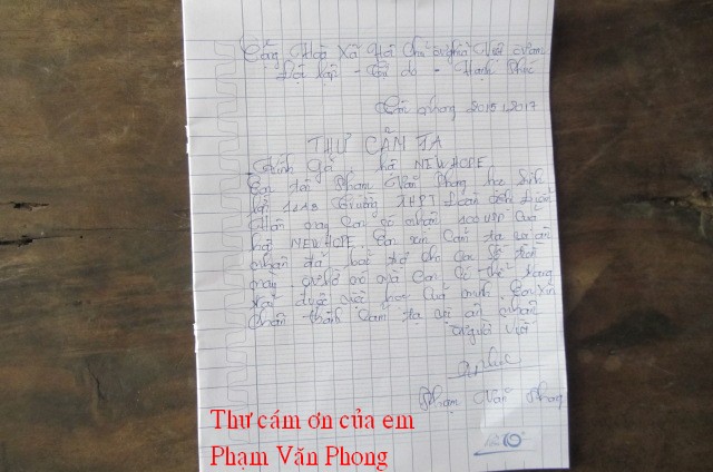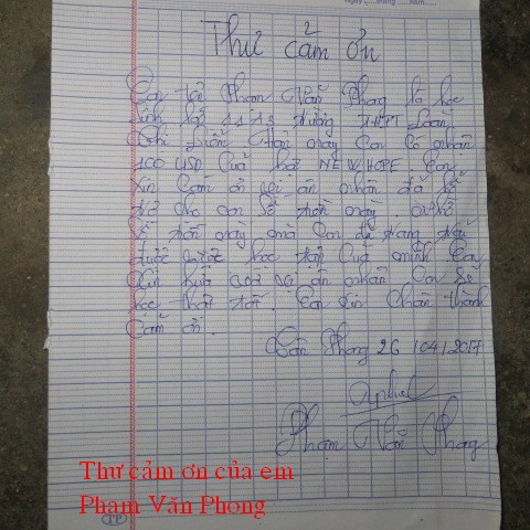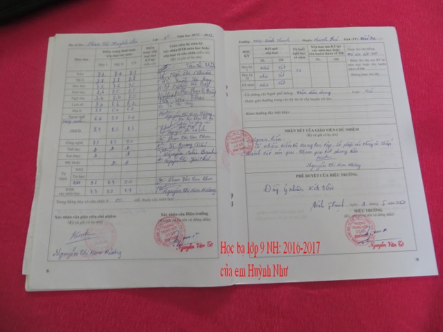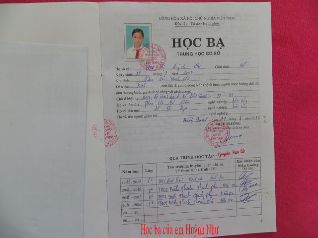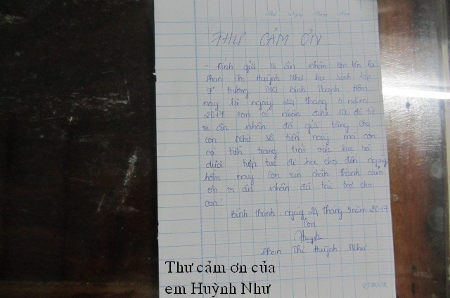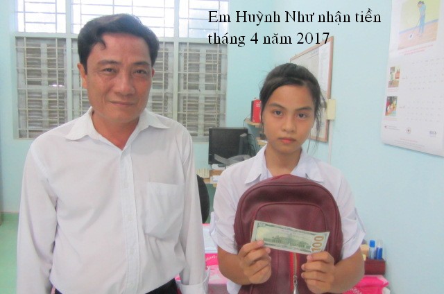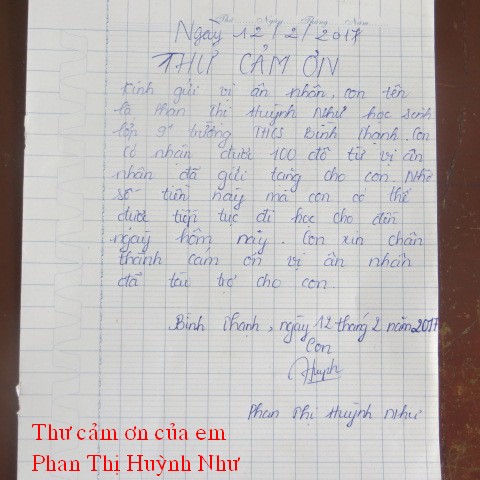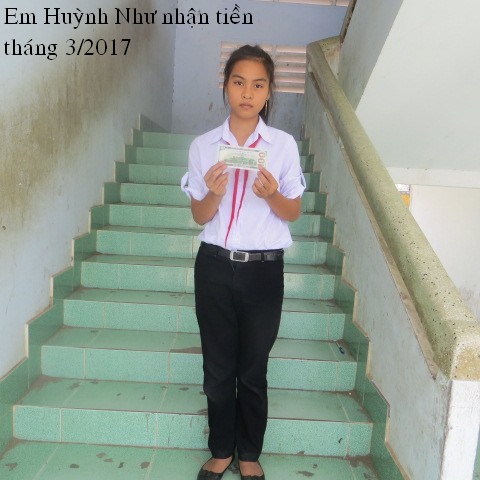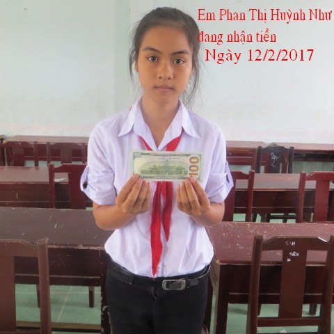 2/ Em Phan Thị Huỳnh Như đang học lớp 9 trường THCS Bình Thạnh. Mẹ em bị bệnh ung thư đã chết cách nay hơn một năm. Nhà em có 4 người. Ba em Ông Phan Văn Bé Chín, 40 tuổi. Chị em là Phan Thị Ngọc Hân, 18 tuổi đang thi đỗ Đại học sư phạm ngành Văn. Bé trai nhỏ mới 2 tuổi. Ba em không nghề nghiệp ai thuê gì làm nấy mỗi ngày 150.000 đồng (7 đô) nhưng ngày có ngày không. thu nhập rất bấp bênh. Hiện ngụ tại số nhà 116/2, ấp Thạnh Quí B, xã Bình Thạnh, huyện Thạnh Phú, tỉnh Bến Tre.