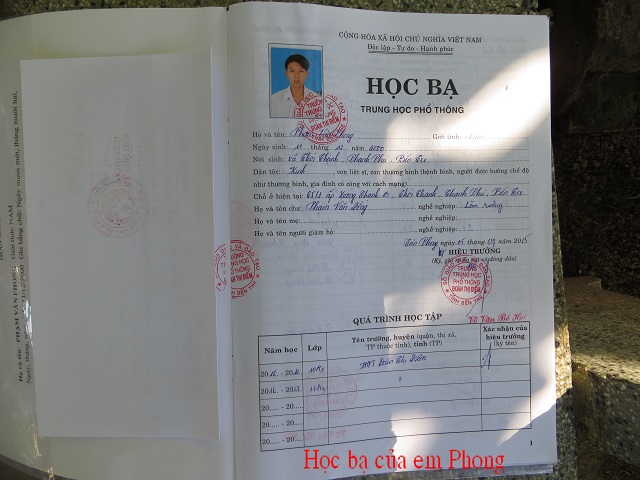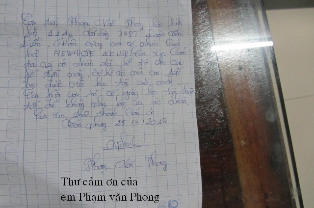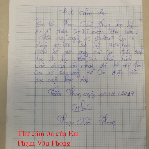 2/ Em Phan Thị Huỳnh Như đang học lớp 9 trường THCS Bình Thạnh. Mẹ em bị bệnh ung thư đã chết cách nay hơn một năm. Nhà em có 4 người. Ba em Ông Phan Văn Bé Chín, 40 tuổi. Chị em là Phan Thị Ngọc Hân, 18 tuổi đang thi đỗ Đại học sư phạm ngành Văn. Bé trai nhỏ mới 2 tuổi. Ba em không nghề nghiệp ai thuê gì làm nấy mỗi ngày 150.000 đồng (7 đô) nhưng ngày có ngày không. thu nhập rất bấp bênh. Hiện ngụ tại số nhà 116/2, ấp Thạnh Quí B, xã Bình Thạnh, huyện Thạnh Phú, tỉnh Bến Tre.