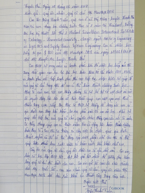 Hôm nay con viết thư này kính xin Quý Ân Nhân, Quý Cô Chú Hội NewHope2008 xem xét và cấp cho con một phần học bổng, con rất mong nhận được sự hỗ trợ giúp đỡ từ Quý Ân Nhân, Quý Cô Chú Hội NewHope2008 để con có thể tiếp tục hoàn thành chương trình học Thạc Sĩ tại Thái Lan của con.