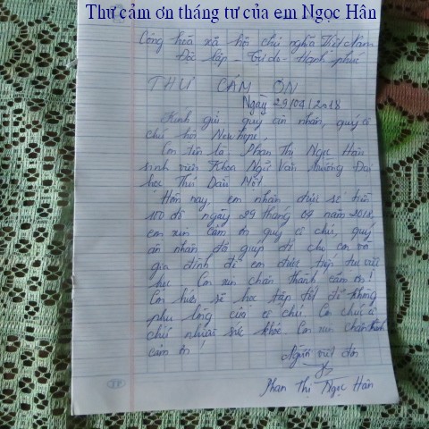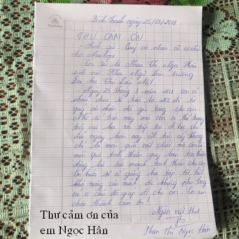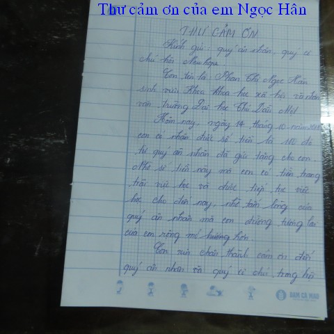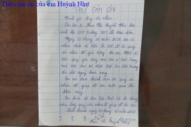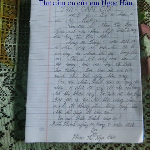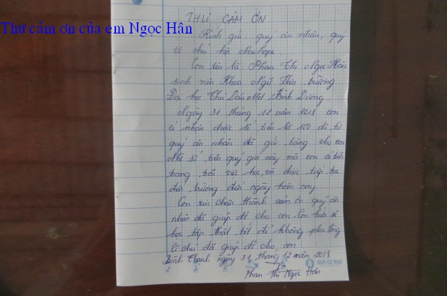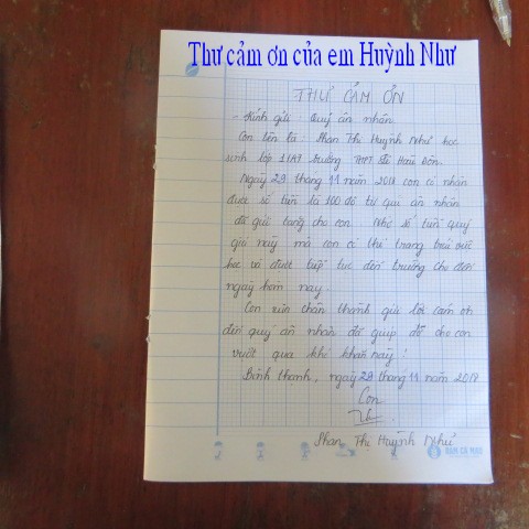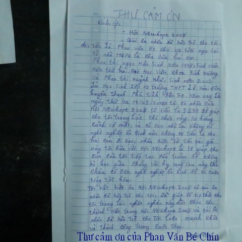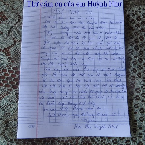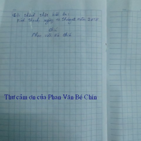 trao $250 của hai bạn này và lá thơ cảm ơn của ông Phan Văn Bé Chín: