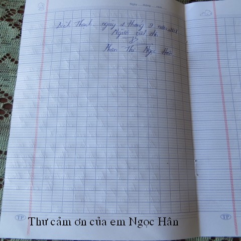Những món quà này được bảo trợ bởi bạn Trần Trinh Thy. Và các em cũng nhận được $200 do sự bảo trợ của bạn Anomymous Donor và The Cone Families. Dưới đây là hình nhận quà và thơ cảm ơn của các em: