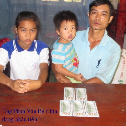 Ms. Tammy Pham gave $300 and Ms. Trang Nghiem $50. Below are pictures of the family receiving $250 ($100 will be passed out next month): and gratitude letter from Mr. Phan Van Be Chin:
