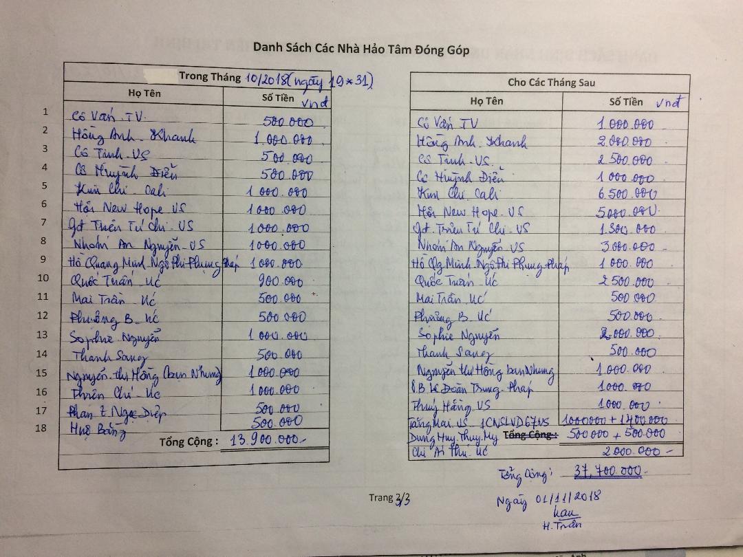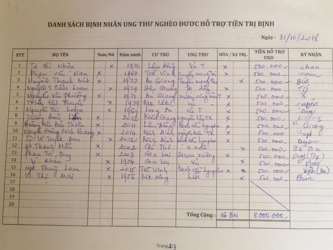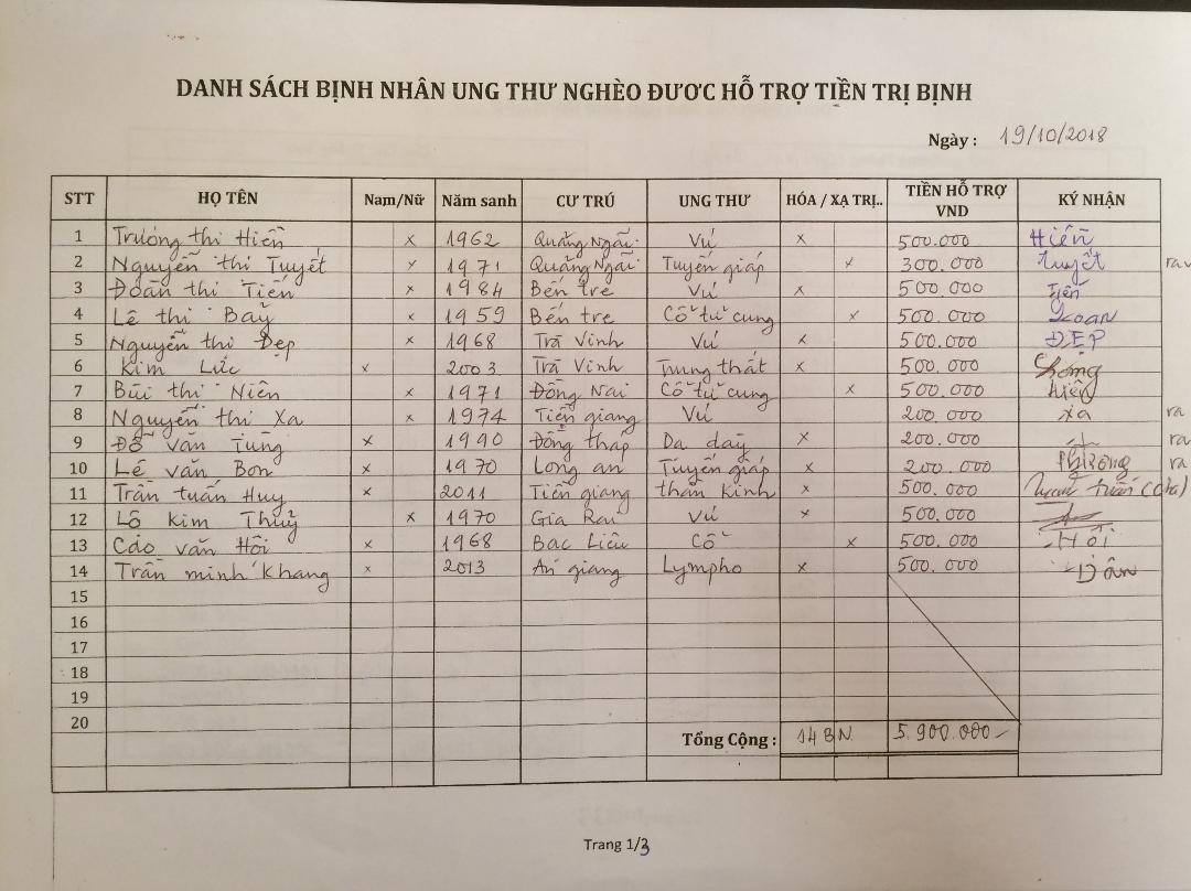 Kính gởi đến qui vị- danh sách các BN Ung Thư đang điều trị tại BV Ung Bướu Tp HCM, được nhóm hỗ trợ tiền thuốc trị bịnh và tiền xe về quê sau đợt điều tri, ngày 19 và 31/10/2018- các nhà hảo tâm giúp cho các BN trong tháng này và các tháng sau và- vài hình ảnh trong buổi hỗ trợ ngày 31/10/18.Có 26 BN nhận đươc 13 triệu đồng phụ giúp tiền thuốc trị bịnh và 4 BN được hỗ trợ 900.000₫ tiền xe về quê khi được xuất viện.