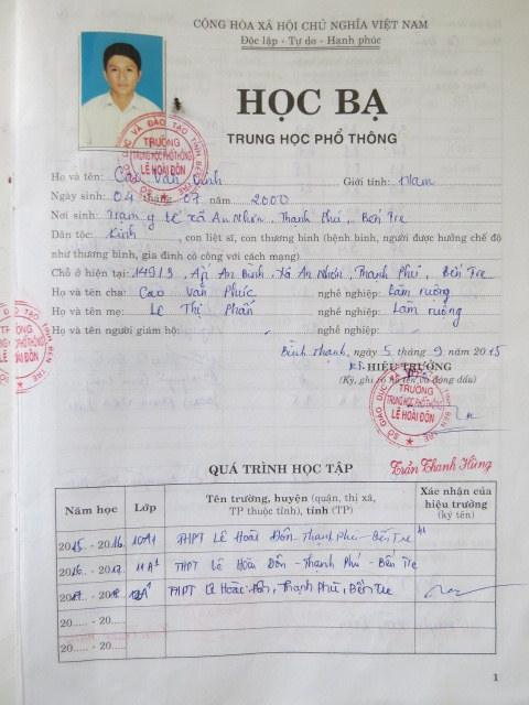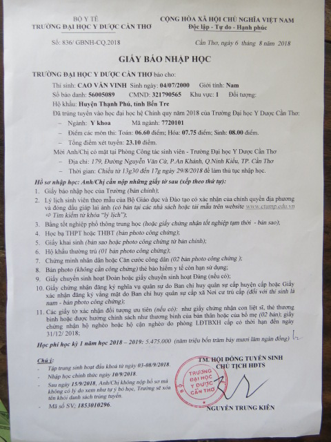 Em Cao Văn Vinh, hiện cư ngụ tại ấp An Bình, Xã An Nhơn, Huyện Thạnh Phú, Tỉnh Bến Tre. Cha mẹ đều đi làm chung nghề chài lưới (đi đăng) ở mé sông, cá tôm khi có, khi không, nhưng chỉ có mùa nước lớn mới làm được, mùa nước ròng cũng không có việc làm, và lúc này thị họ đi nhỏ cỏ, bó chổi, hay cứ ai thuê gì làm nấy, mỗi ngày lúc đói, lúc no, không ổn định. Cuộc sống rất khó khăn nên cũng không giúp em Vinh được gì nhiều để chi tiêu cho đại học, em cũng tự mình cố gắng rất nhiều để dành tiền. Em đã đi làm đến ngày cuối cùng trước khi khăn gói lên đại học và em rất tiết kiệm, ngày nào cũng mang cơm ở nhà theo để ăn. Em có mơ ước làm bác sĩ và đang là sinh viên năm thứ nhất ở đại học Cần Thơ . Ngành y học tốn rất nhiều tiền, mà sức của cha mẹ em có hạn, nên em rất cần sự giúp đở thêm để đi hết quãng đường đại học. Vì để đủ tiền trang trãi chi phí ăn ở, em đã cố gắng làm sương sa đi bán sau giờ học .