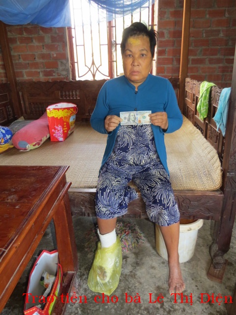 Le Thi Dien, 55 years old, resides at Thanh Phong hamlet, Thanh Phu village. Her husband passed away 10 years ago and currently living with her son, 19 years old, and supports her. Their house was giving by a philanthropists 4 years ago. She suffers numbness in her hands and feet as well as body ache. A month ago she was involved in a hit and run accident and resulted 1 amputated leg and the other leg broken and had 6 stiches on her head. She has no money for medical bills and relied on her neighbor to help out with her medical bills.