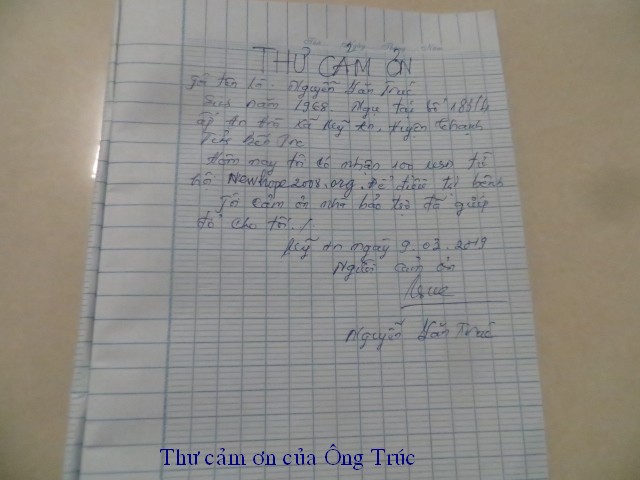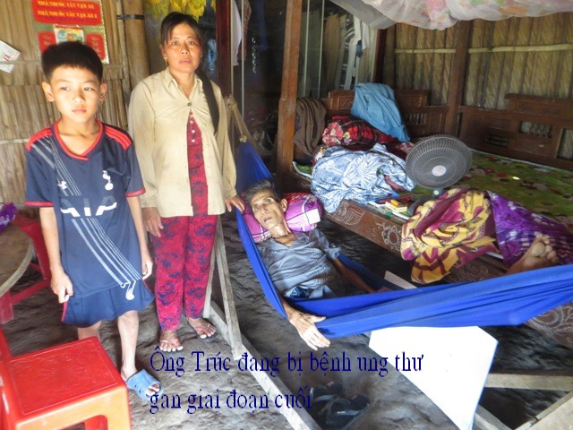 Nguyen Van Truc, 51 years old, and Huynh Thi Ly, 50 years old, reside at 183/4, An HOA hamlet, My An village, Thanh Phu district, Ben Tre providence. They have 2 sons. The oldest working in Ho Chi Minh city; the other is 10 years and in 4th grade. He has liver cancer last stage and can’t eat. She works as hand made broom and making $2-4/day