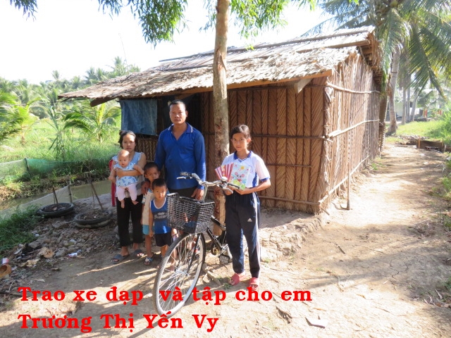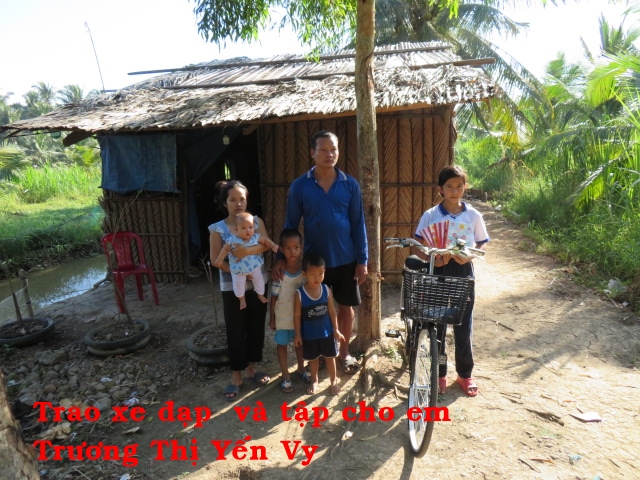 Số tiền $100 ân nhân bảo trợ cho đã giúp em mua được chiếc xe đạp và 10 cuốn tập. Đây là chiếc xe đạp loại tốt hơn bình thường nên em sẽ xài được hết trung học. Ở quê ít có đường tráng nhựa nên những con đường đê lòi lỏm dễ làm xe đạp hư nhanh hơn đường tráng nhựa ở thành phố, các căm xe hay bị cong và hư nhanh hơn. Dưới đây là hình ảnh phát xe đạp và tập cho em Trương Thị Yến Vy ở trước cửa nhà Cậu của em: