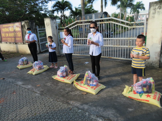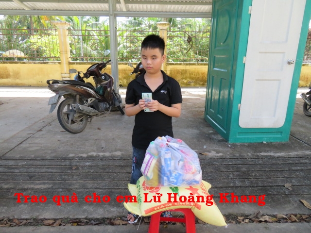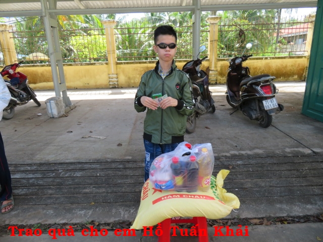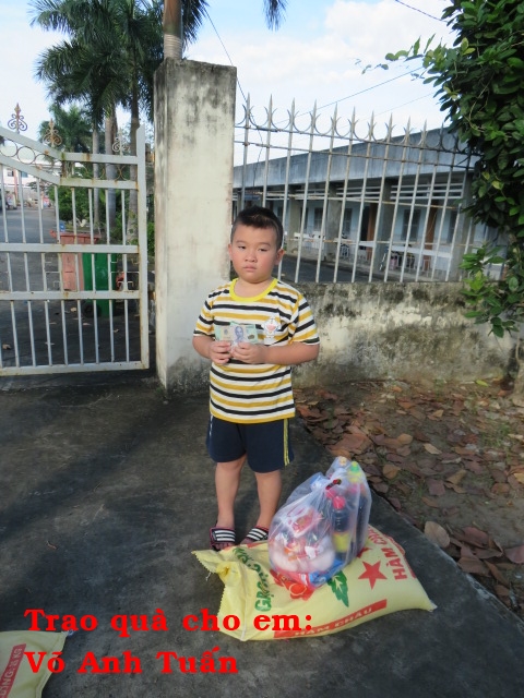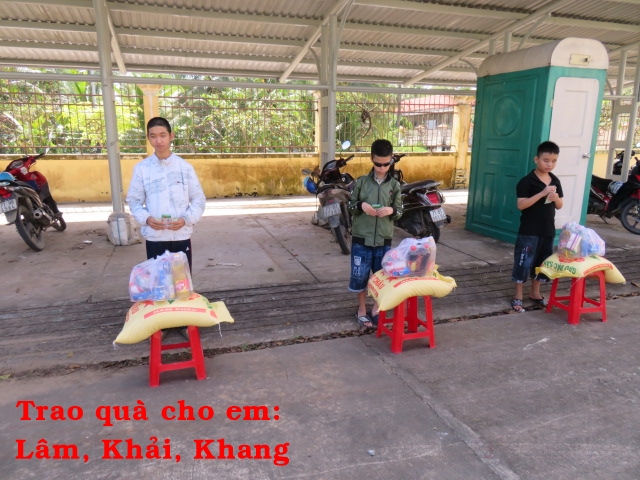 Mỗi em được tặng 1 phần quà trị giá $50 gồm có ½ thực phẩm và ½ tiền mặt. ( Và 1 chai dầu xanh là quà tặng thêm). Mỗi phần quà gồm có: 1 bao gạo 25 ký (55 lbs), 2 kí lô đuờng (4.4 lbs), 2 chai nước tuơng, 2 chai nước mắm, 1 bịch xà bông giặt đồ 1 kg (about 2.2 lbs), 1 bịch bột ngọt (450 grams), 1 chai dầu ăn, 1 lọ nước rửa chén, 1 ống kem đánh răng, 1 lon sửa bò, và 5 gói mì tôm, 3 túi muối, 1 chai dầu xanh, và 500,000 đồng tiền mặt (khoảng 22 US dollars).