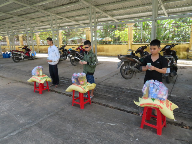 Each gift package is worth $50 which consists of ½ in food and ½ in cash, (and a bottle of medicated oil, this is extra gift). Each food package has: 25 kilograms of rice (55lbs), 2 kilograms of sugar (4.4 lbs), 2 bottles of soy sauce, 2 bottles of fish sauce, 1 bag of detergent 1kg (2.2lbs), 1 bag of cooking seasoning (454 grams), 1 bottle of cooking oil, 1 bottle of dish washing liquid, 1 tube of toothpaste, 1 can of condensed milk, 5 bags of noodles, 3 bags of salt, 1 bottle of medicated oil and 500,000 VN dong cash (about $22 US dollars).