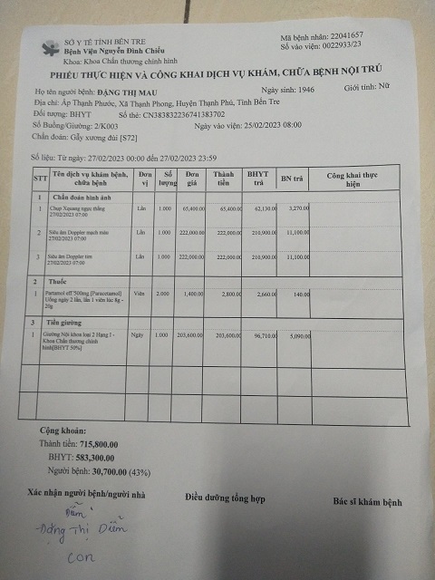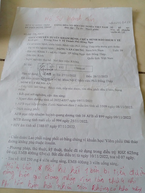 Ms. Dang Thi Mau, 77 years old, resides in Bon Bon, Thanh Phong commune, Thanh Phu district, Ben Tre province. Her family is very poor. More than 30 years ago her husband Dang Van In was paralyzed on one side, the whole family was taken care of by her. More than 6 years ago, 5 days after her husband died, she had a stroke and have been bed bound since then. Currently, she fell and broke her femur and is in Ben Tre hospital waiting for the surgery schedule. Her children are also poor, the second child, Mr. Dang Van Chung, got married and followed his wife's hometown in Dong Thap province. Currently, he does not have a house and has to stay with relatives. More than a year ago, Mr. Chung suffered from lung disease and has now operated many times. The lives of both Ms Mau and Mr Chung are very hard because all the money were spent on hospital bills but they are sick and cannot work; so they desperately need money for treatment.