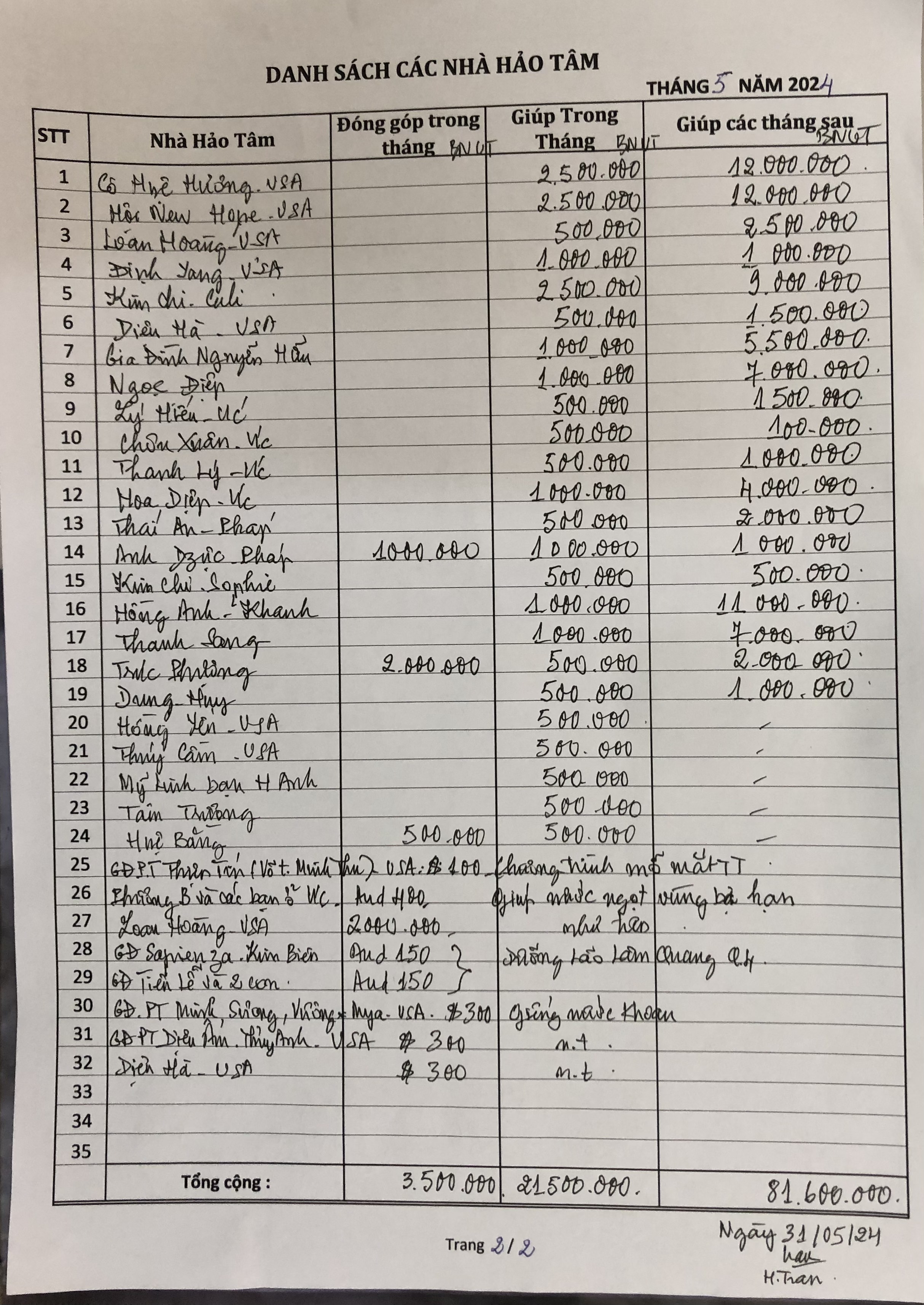 1./Tặng nước uống cho dân bị hạn hán, nước bị nhiễm mặn ở Tiền Giang và Bến Tre . ( chi tiết cùng hình ảnh đã được gởi qua email ngày 20/5/24.