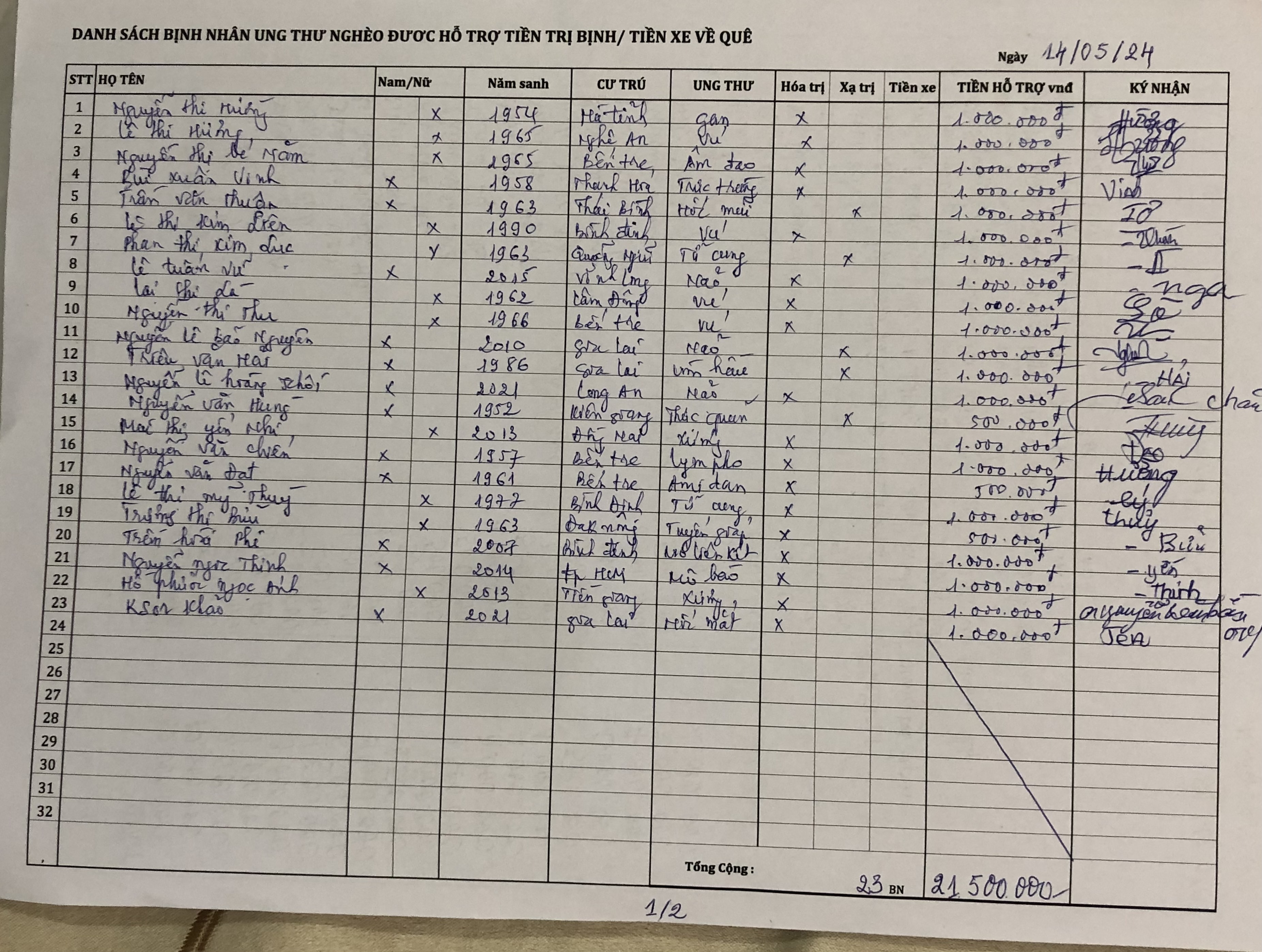 Hỗ trợ 21,5 triệu tiền trị bịnh cho 23 Bệnh Nhân.