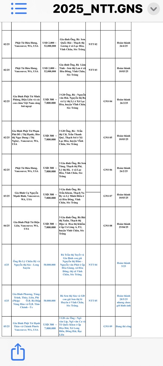 Chi tiết về nhà tài trợ, gia đình được tặng cùng tiến độ thực hiện trong hình