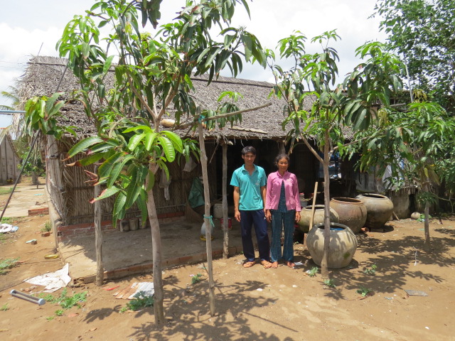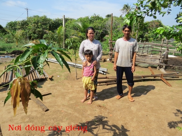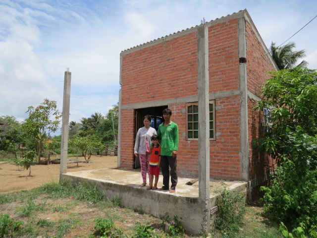 Mr. Dang Vu Linh, age 33, of Nha Dua, Thanh Hai Village, Thanh Phu District, Ben Tre Province is living with his wife and their child. The wife is now 6 moths pregnant. Every day, Mr. Linh works for hire, catching fish with a net, but this is an unsteady job, just enough to live on temporarily. They used to get help from a sponsor to build up their house but the later got financial difficulties and stopped the support so their house was left unfinished without the roof in the front part.