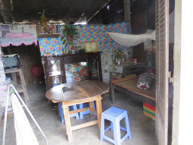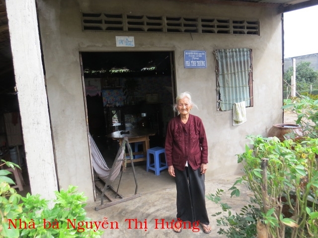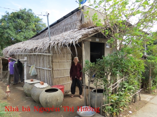 Bà Nguyễn Thị Hưởng 87t ở ấp 4 xã An Thuận huyện Thạnh Phú. Bà sống một mình, hàng ngày đi lượm ve chai về bán để mua gạo. Nhà không có giếng nước xài phải xin của hang xóm xách về. Căn nhà được chính phủ cho nay hơn 7 năm, nóc lợp bang tol thiết nay bị mục nên phải che mủ phía trên cho khỏi dột.