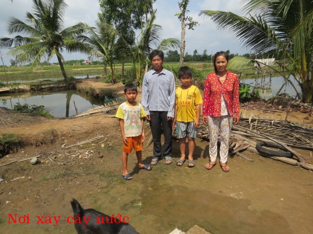 Bùi Văn Hùm 36t ở Bên Chổi xã An Qui huyện Thạnh Phú. Gia đình có 4 người: vợ và 2 con, nhà không ruộng đất vợ chông hang ngày ai thuê gì thì làm nấy. nhà không có cây giếng nên phải xin của bà con về xài. Rất cần nước.
