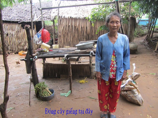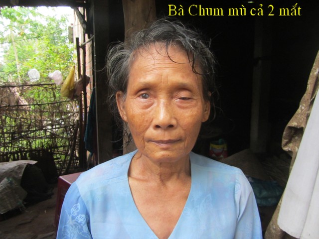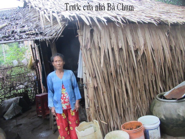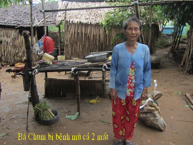 Mrs. Huynh Thi Chum, 72 years old. She has a son, working far away. She is living alone and blinded one eye. She belongs to the poor support group and has no well. Every day, she has to carry water from the rivers around home that have been contaminated with a lot of salt. She earns about 50 cents a day and is not enough to live; she has to rely on her neighbors for food. She lives at 160/7 An Ninh Hamlet, An Thuan Village, Thanh Phu District, Ben Tre Providence.