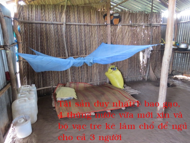 Lê Văn Quyển 42t ở ấp 6 xã An Qui huyện Thạnh Phú. Gia đình có 3 người: ông và 2 con, vợ ông vì nghèo nên đã bỏ đi. Hàng ngày ai thuê gì thì ông làm nấyđể kiếm tiền nuôi con. Nhà không có giếng phải đi xin cho vào thùng rồi bè ờ dưới mương nước về tới nhà xách lên xài