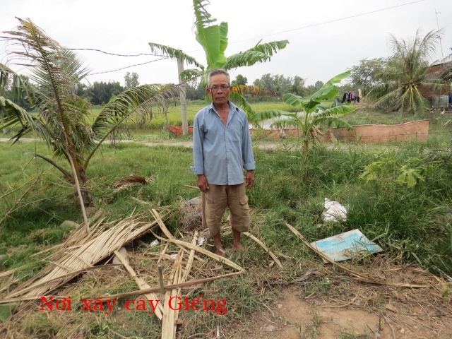 Ông Lê Văn Nhồng 63t số nhà 273/1 ở ấp Giang Hà xã An Điền huyện Thạnh Phú tỉnh Bến Tre. Ông sống một mình, không con, hàng ngày cuộc sống ai thuê gì thì làm nấy phù hợp với sức khõe của ông. Nhà không có cây giếng chỉ có mùa mưa thì xài nước ngọt( nước mưa) còn mùa khô thì xách nước nặm dưới kênh lên xài rồi rửa lại nước ngọt nên rất khó khăn về nước. Rất cần cây giếng nước ngọt xài.