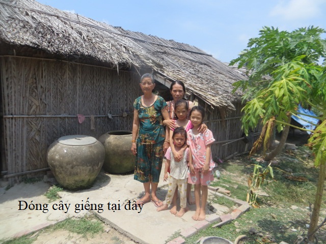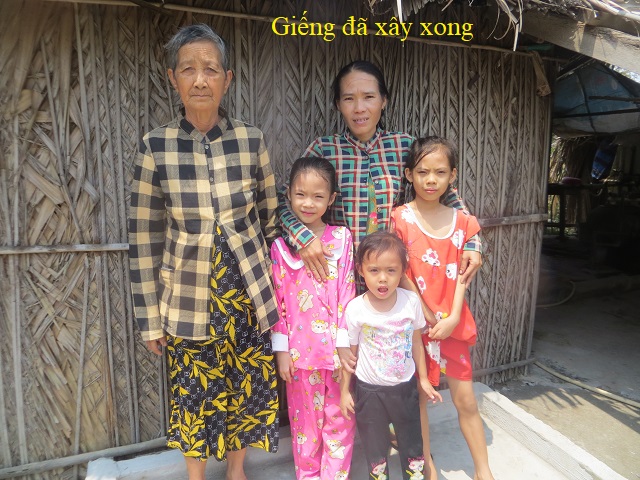 Ms. Le Thi Quyen, 78 years old. Her husband passed away, currently living with her daughter-in-law named Tran Kim Sang, 41 years old. Ms. Sang has 3 young children named Le Thi Kim Ngan, 10 years old in 4th grade, Le Thi Kim Yen, 8 years old in 2nd grade and Le Thi Kim Xuyen, 4 years old. The whole family lives at house number 8/3, Thanh Binh hamlet, Binh Thanh commune, Thanh Phu district, Ben Tre province. Ms. Quyen's family belongs to a poor household. Her family does not have a well, so she has to use salt water in the dry season.