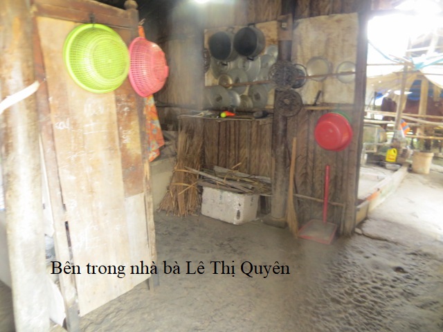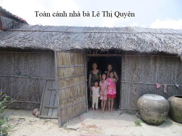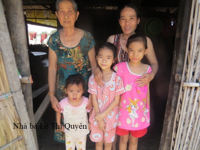 Bà Lê Thị Quyên, 78 tuổi. Chồng đã mất, hiện đang ở chung với con dâu tên Trần Kim Sang, 41 tuổi. Bà Sang có 3 con nhỏ tên là Lê Thị Kim Ngân, 10 tuổi học lớp 4, Lê Thị Kim Yến, 8 tuổi học lớp 2 và Lê Thị Kim Xuyến, 4 tuổi. Cả gia đình đều ngụ tại số nhà 8/3, ấp Thạnh Bình, xã Bình Thạnh, huyện Thạnh Phú, tỉnh Bến Tre. Nhà bà Quyên thuộc diện hộ nghèo, nhà bà không có cái giếng nước nên phải xài nước mặn vào mùa khô.